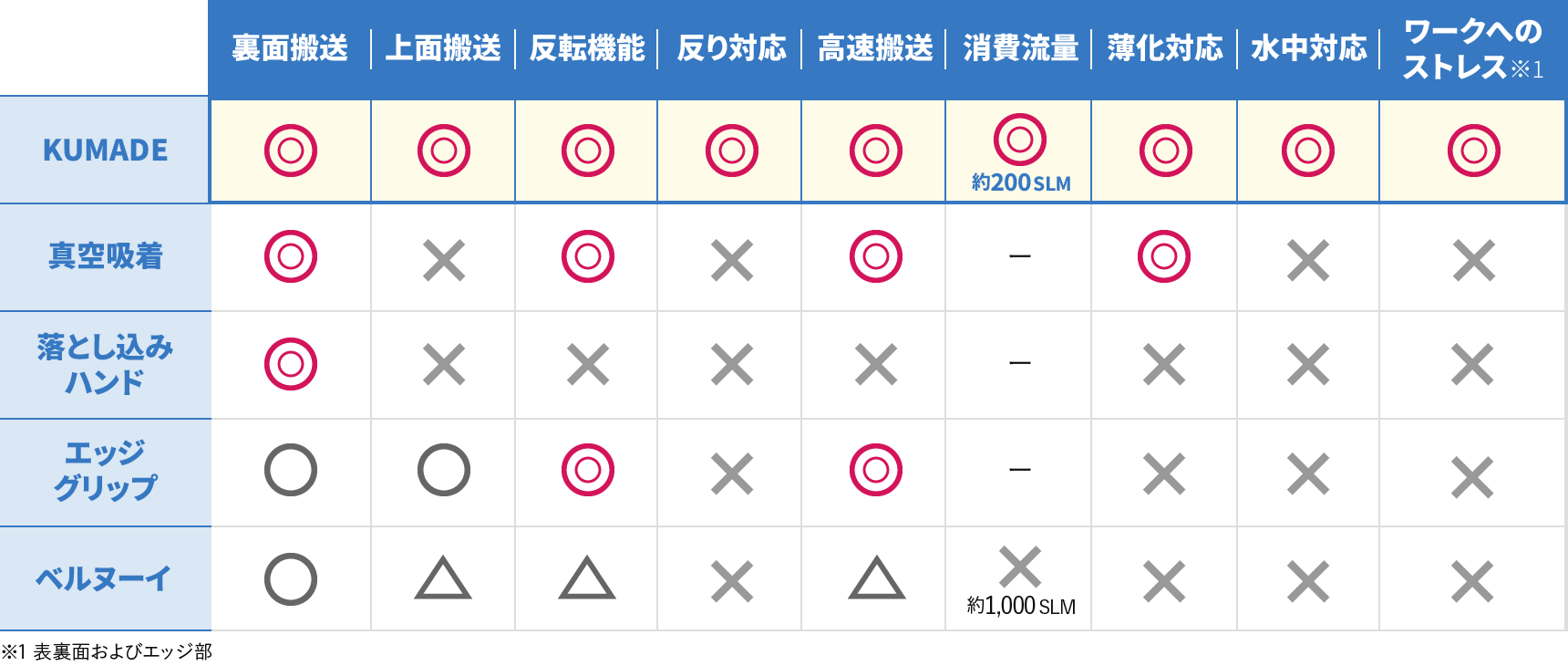 KUMADEは上面から直接搬送できるため、ステージ側での持ち替えが不要となり、設備構成の簡素化とコスト削減に貢献します。-
