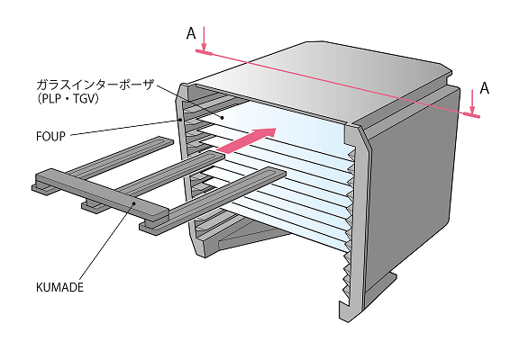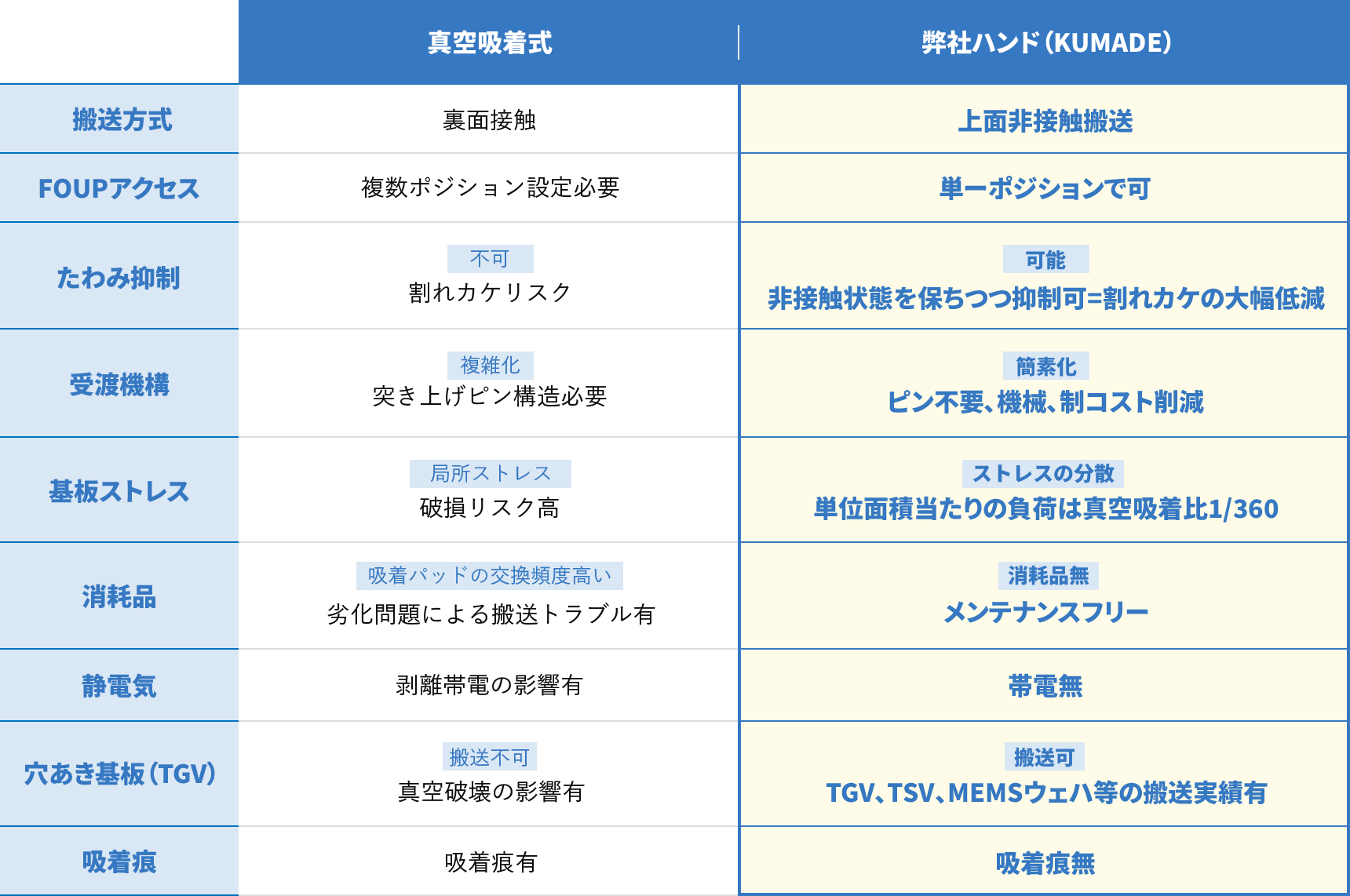 KUMADEは、上面から非接触搬送を実現することで、FOUP内の基板に対して安定したアクセスが可能となり、搬送工程の信頼性と効率性を向上させます。-