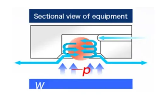 円筒室内にて高速の旋回流を発生させ、旋回流中心部の負圧によりウェハを非接触グリップする新しい概念から生まれたVortex Chuck です。