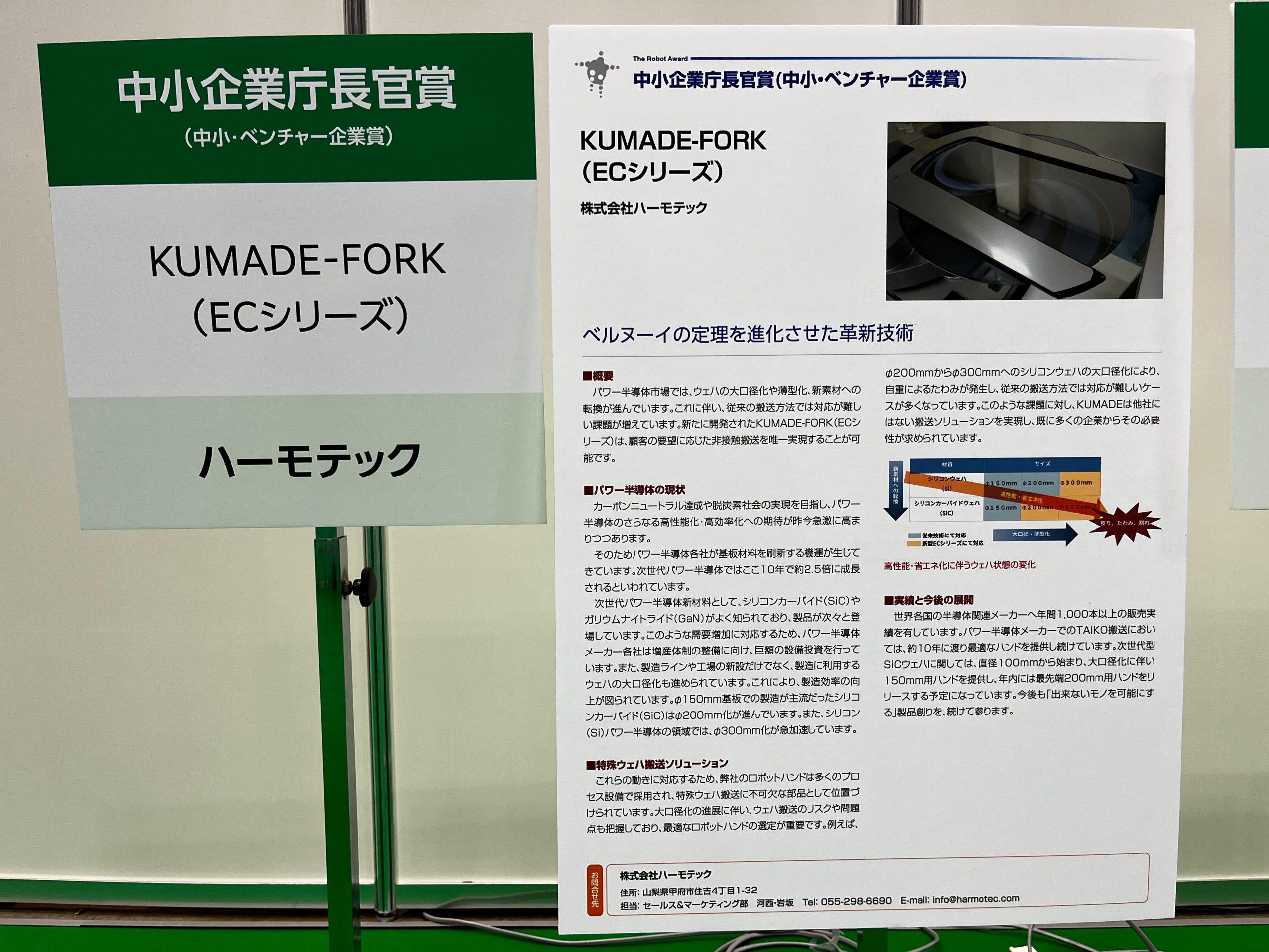授賞式には、多くのロボット業界関係者が集まり、受賞者たちの技術や製品が紹介されました。KUMADE-FORK(ECシリーズ)は、精密なウェハー搬送を実現するその技術力が認められ、表彰される場面では多くの祝福と注目を集めました。