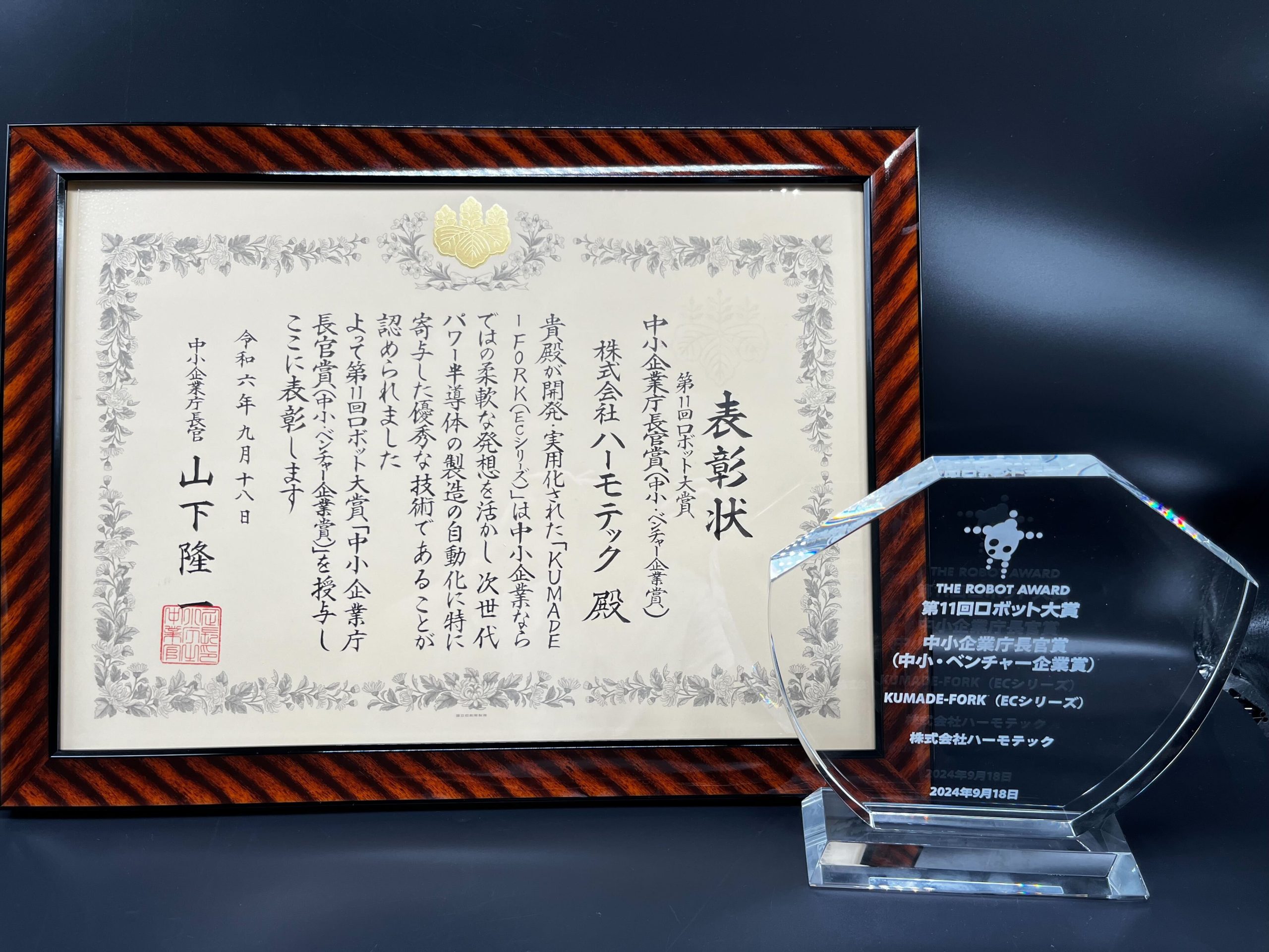 令和6年9月18日、東京ビッグサイトにて開催された「Japan Robot Week 2024」の場で、「第11回ロボット大賞」の授賞式が執り行われました。当社の製品「KUMADE-FORK(ECシリーズ)」は、中小企業庁長官賞(中小・ベンチャー企業賞)を受賞し、その技術革新と社会的貢献が改めて評価されました。