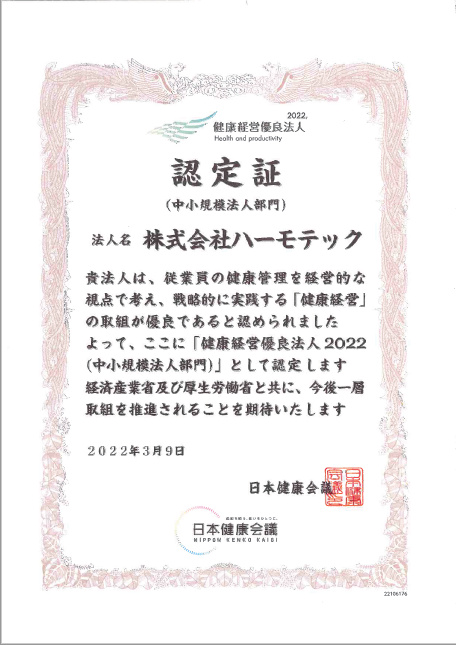 弊社の従業員の健康管理向上に向けた取り組みが評価されました。