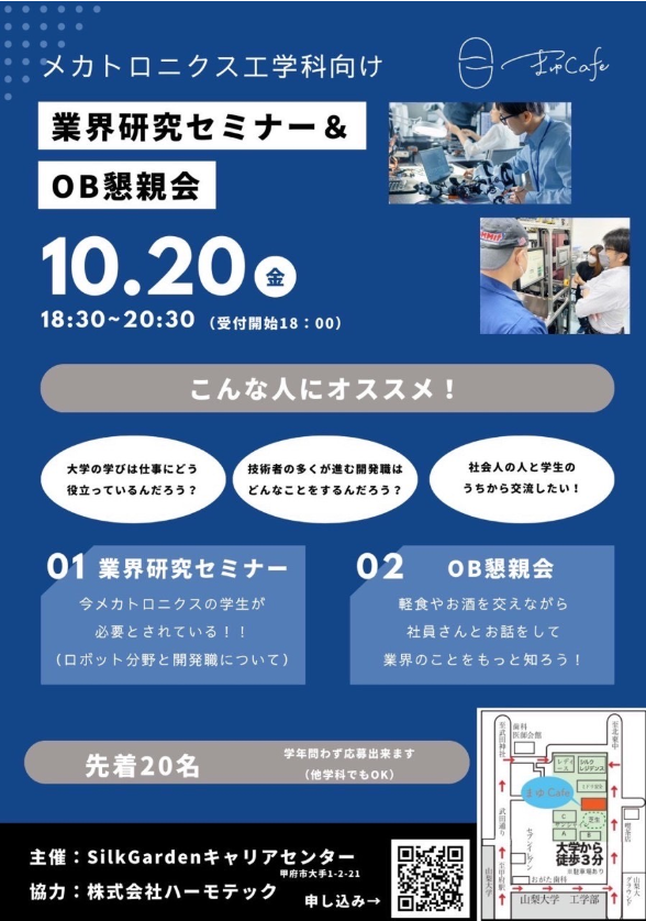 お知らせ10月20日(金)シルクガーデン内まゆCafeにて、山梨社様の協力のもと「メカトロニクス工学科向け業界研究セミナー」が開催されました。